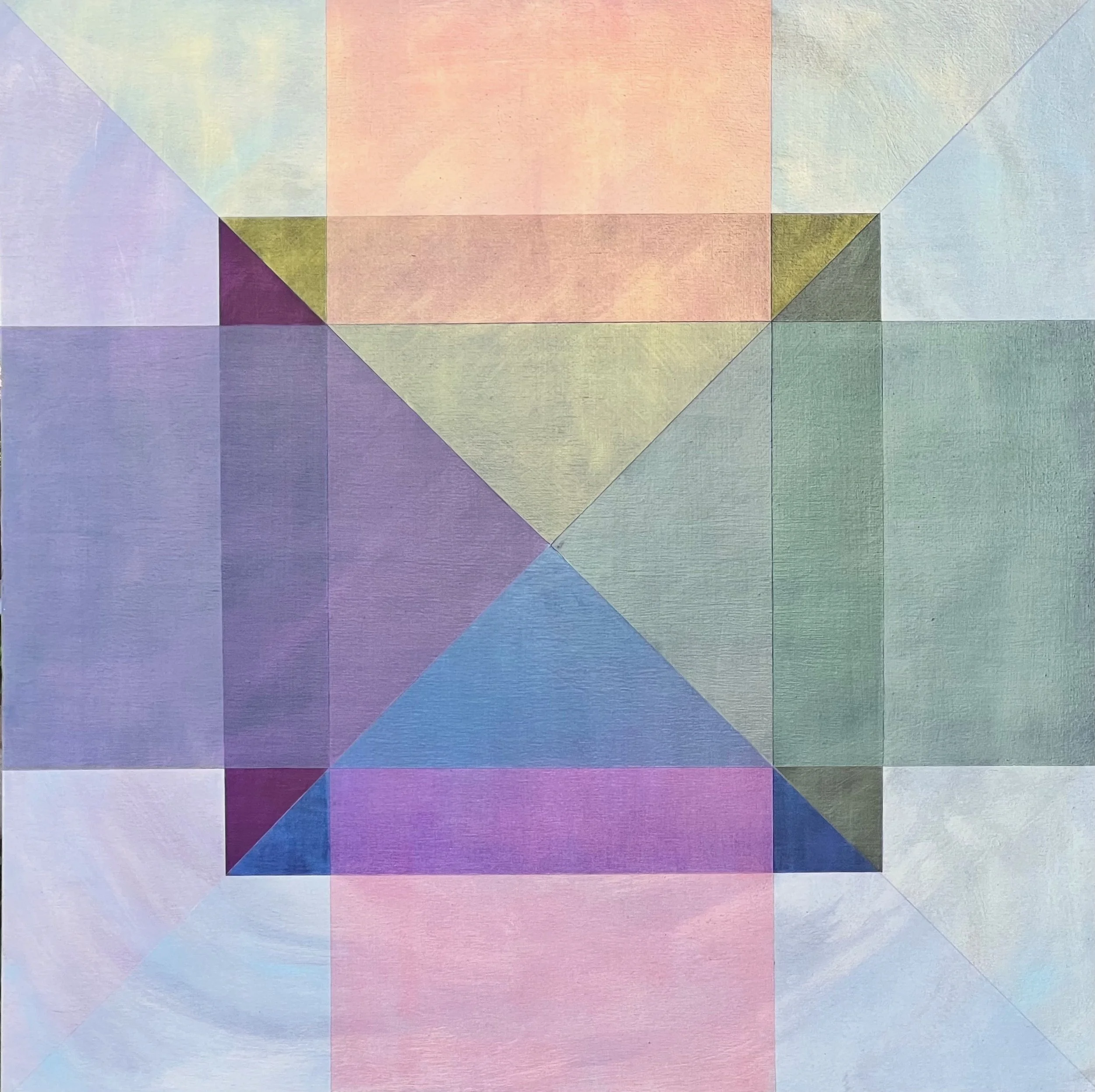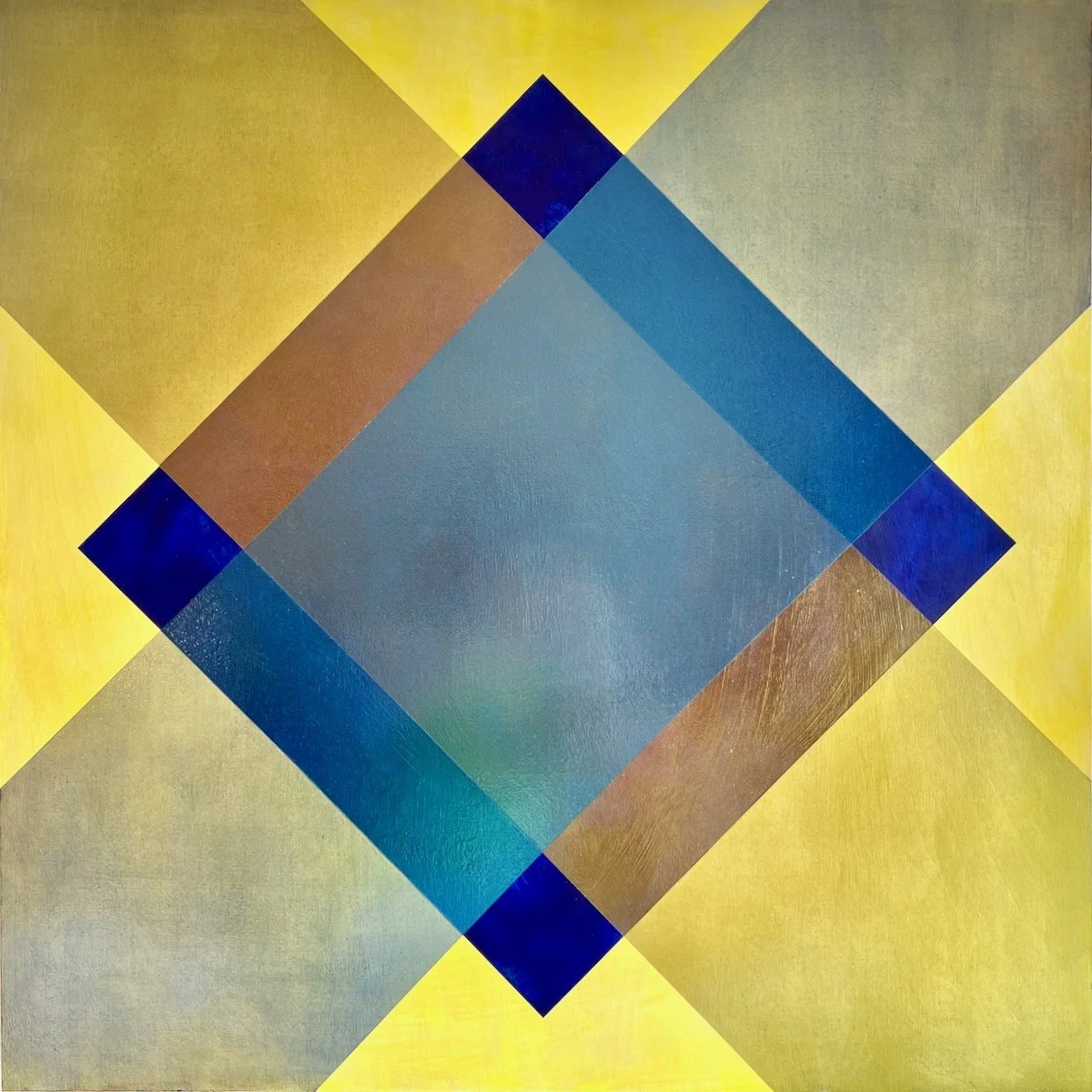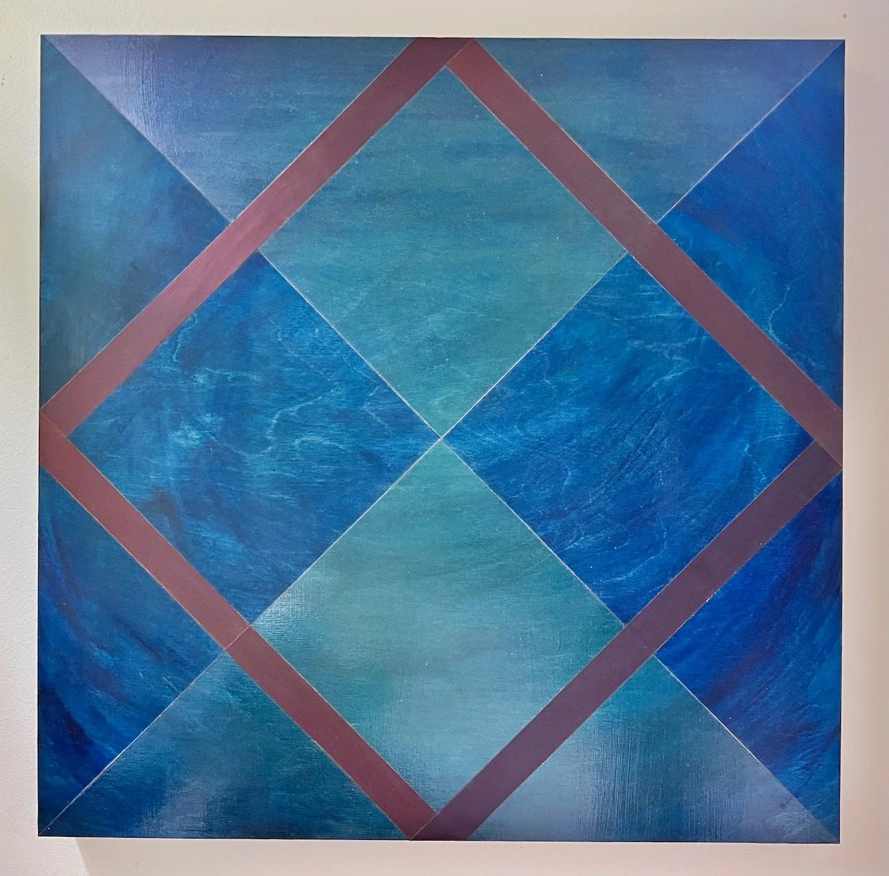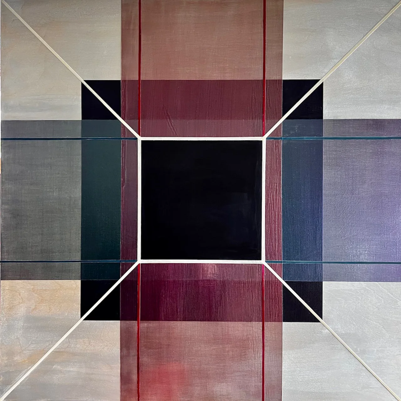 The paintings in Flatland explore geometric projections of 4-dimensional cubes onto flat wooden panels, using acrylic paint and multi-chrome pigments. Flatland serves as a metaphor for our desires and attempts to understand the inexplicable—complicated facets of problems without attainable solutions—in the specific case, due to our perceptual limitation to 3 dimensions—but also in other cases, such as our inability to understand people who think radically differently from us.